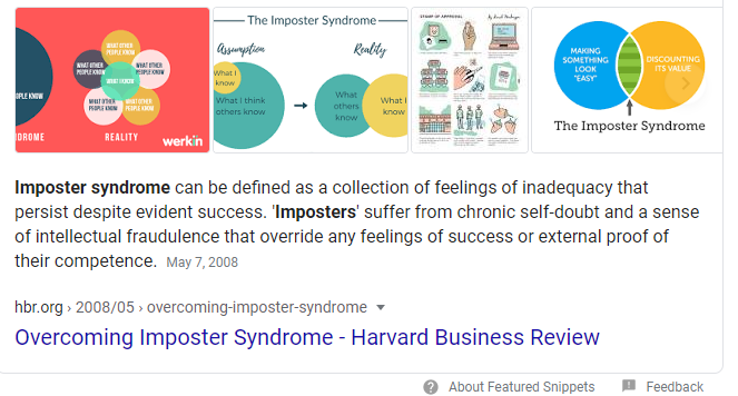 As you can see in the top image if you type Imposter Syndrome in google, that is what you see and the explanation of it. However, I just want to make some cases about it. This syndrome was in peak stage for me, especially when I was in India, preparing hard to perceive IIT, after my 12th grade. Even after preparing for it, I felt unsatisfied. You might think I'm crazy enough to leave the opportunity in India and study in the USA. Well, Its actually a personal decision I made against all the necessary inadequacy. Parenting was also a major issue for a few students, where they had to push them a lot harder in pursuing a career that is in Demand, instead of their dream career. There is this opinion, the more you spend, the better education you get. This actually works in most of the countries. I was lucky enough that I was able to pursue my career in personal interest. If you pursue a career in Vogue, that fetches you oblivion except for a job with a high salary but no satisfaction. Don't you think this is an issue of unemployment? Why not use intellect to predict something more in Agriculture, Food, Financing, other industries especially in countries like India, where they have tons of people graduating with CS Major. That is not a topic here. Nevertheless, you should definitely acknowledge this for future generations.